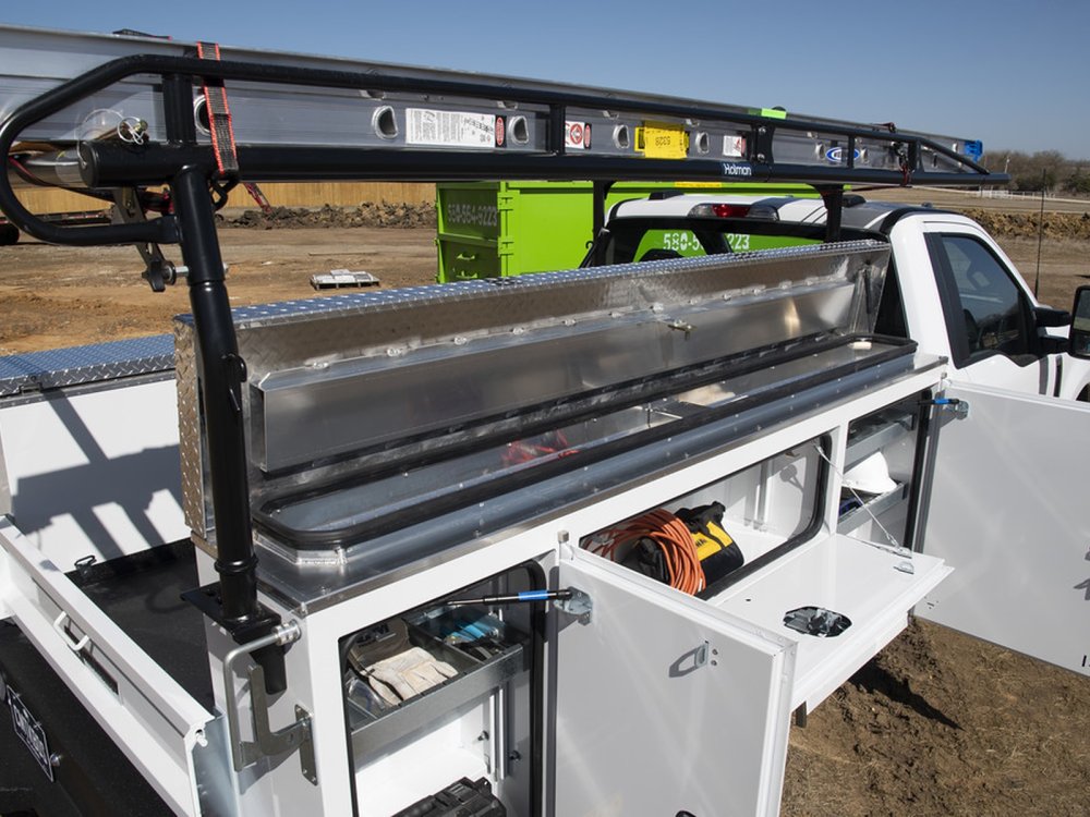 Treadbrite aluminum compartment tops Solid aluminum compartment tops provide strength to the tops of our toolboxes and all that they can hold.