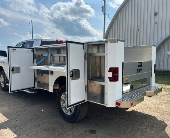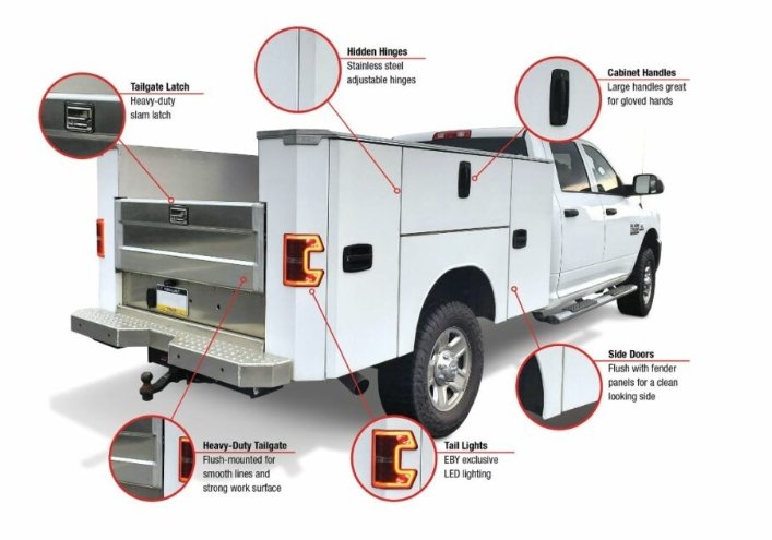 Wireless Remote E Lock System Included STANDARD SPECIFICATIONS DOORS ALUMINUM SERVICE BODY Powder coated, two panel, aluminum doors with integrated rain gutter Protected door seals keep cargo dry and safe Hidden hinge compartment door technology Oversized rotary latch handles with stainless steel latch mechanisms TAILGATE BED SIDES & CABINETS One piece extruded anodized aluminum tailgate with anti-skid ribbing Heavy duty steel slam shut latch stands up to years of use Flush mounted tailgate with a robust work surface area 49" × 99" floor provides a large loading area 6 recessed tie downs in floor plate Fully interlaced understructure and side-pack support system Unique partial sheer punched 3/16" floor Taller, deeper cabinets to store more tools 2 shelves per vertical cabinet with dividers 1 shelf in each horizontal cabinet with dividers SAFETY & SECURITY LED Stop/Tail/Turn and Back-Up lighting with integrated strobe (Made in USA) BOTTOM LINE Eby E-Lock System - Remote control cabinet locking system (Optional) Inside compartment LED lighting (Optional) Best In Class Return On Your Investment.
