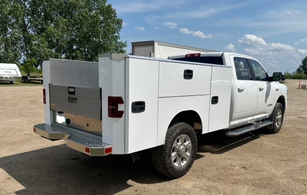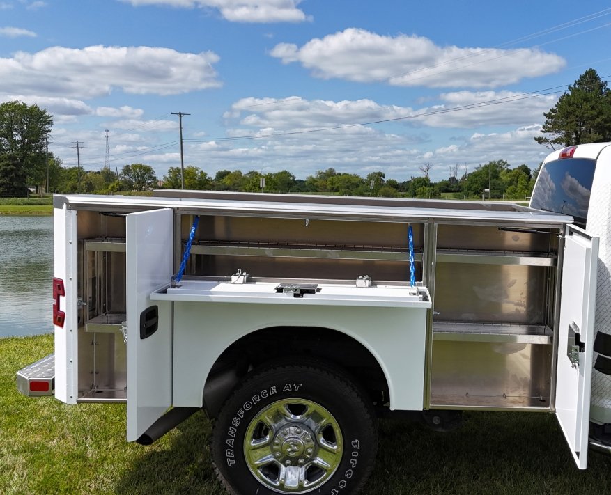Wireless Remote E Lock System Included STANDARD SPECIFICATIONS DOORS ALUMINUM SERVICE BODY Powder coated, two panel, aluminum doors with integrated rain gutter Protected door seals keep cargo dry and safe Hidden hinge compartment door technology Oversized rotary latch handles with stainless steel latch mechanisms TAILGATE BED SIDES & CABINETS One piece extruded anodized aluminum tailgate with anti-skid ribbing Heavy duty steel slam shut latch stands up to years of use Flush mounted tailgate with a robust work surface area 49" × 99" floor provides a large loading area 6 recessed tie downs in floor plate Fully interlaced understructure and side-pack support system Unique partial sheer punched 3/16" floor Taller, deeper cabinets to store more tools 2 shelves per vertical cabinet with dividers 1 shelf in each horizontal cabinet with dividers SAFETY & SECURITY LED Stop/Tail/Turn and Back-Up lighting with integrated strobe (Made in USA) BOTTOM LINE Eby E-Lock System - Remote control cabinet locking system (Optional) Inside compartment LED lighting (Optional) Best In Class Return On Your Investment.