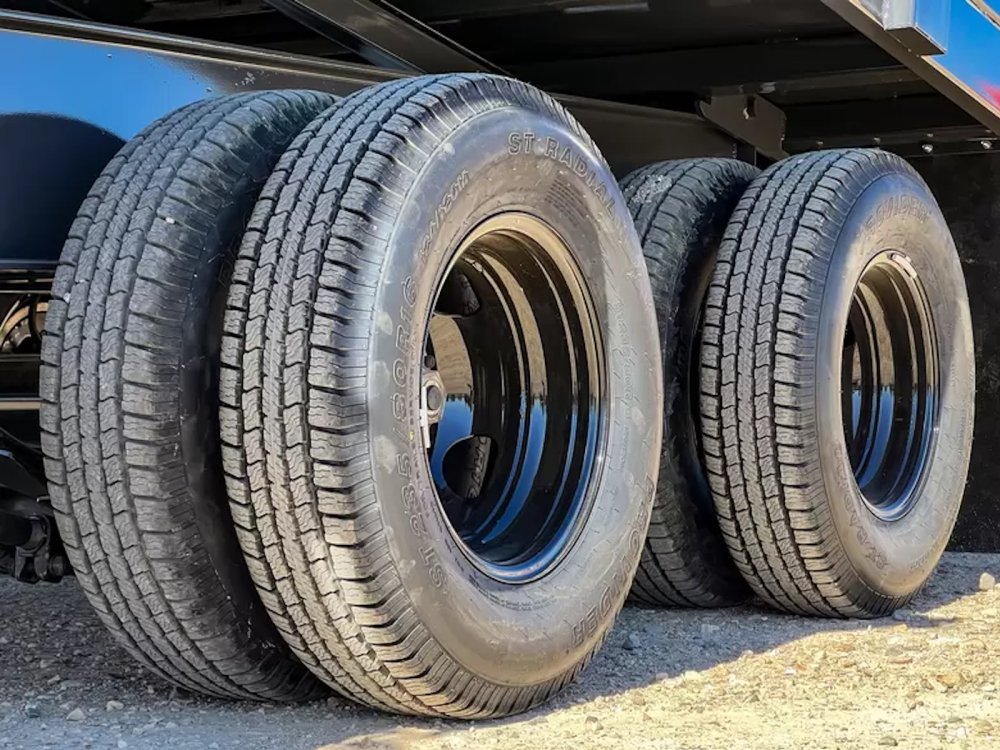 - T80 Tarp System (Front Mount Galvanized Manual) Dual Mud Flaps Sealed Wiring Harness D-Rings 3 x 5/8" (8 Each) Spare Tire ST 235/80 R16 LRE 10 Ply Stake Pockets Flow Control Valve 2" x 6" Top Rail & Up Right Tubing Side Step Plate & Ladder Heavy Duty Suspension System Heavy Duty 16" x 96" Slide-in Ramps