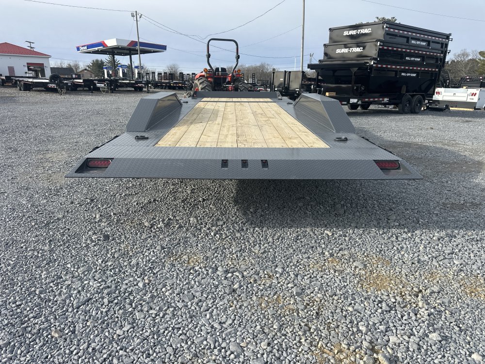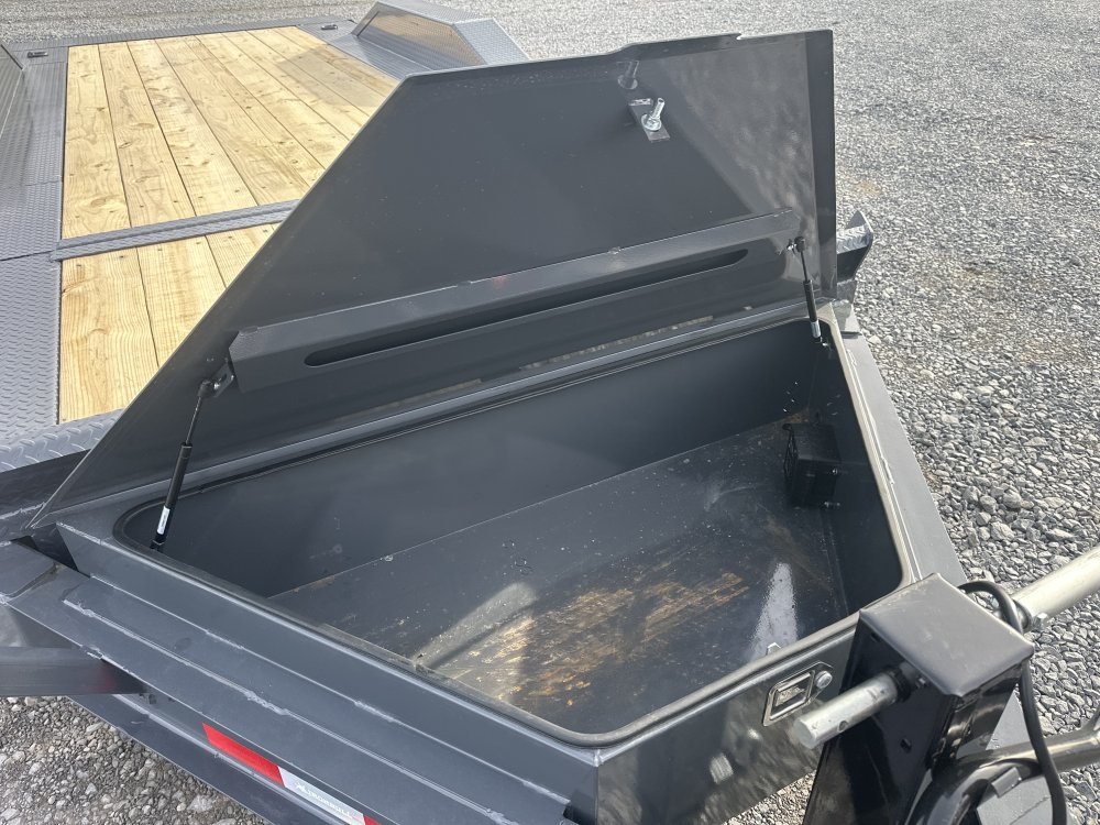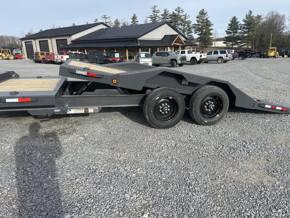 - 8" 10 lb I Beam Frame 235/80 R16 Radial Tires 14 Degree Tilt Angles 14k GVWR 4,400 lbs est Weight (20') Gravity Tilt Oversized Front Toolbox 2 - 7,000 lb Torsion Axles Cambered Torsion Axles 2 5/16" Adjustable Auto Latching Coupler 3" Structural Crossmembers Knife Edge Tail (1/4" Diamond Plate) Removable Diamond Plate Fenders Rub Rail and Stake Pockets 10k Drop-Leg Jack 4 Standard 3" D-Rings E-Z Lube Hubs Black Mod Wheels* 3" x 10" Cylinder with 1.5" Shaft Multi-Leaf Slipper Spring Suspension Treated Pine Floor Lifetime LED Lighting All Lighting DOT Approved Molded Sealed Harness with Resistors 7-Way Receiver Female Plug with Adapter Powder Coat & Primer 23" Deck Height