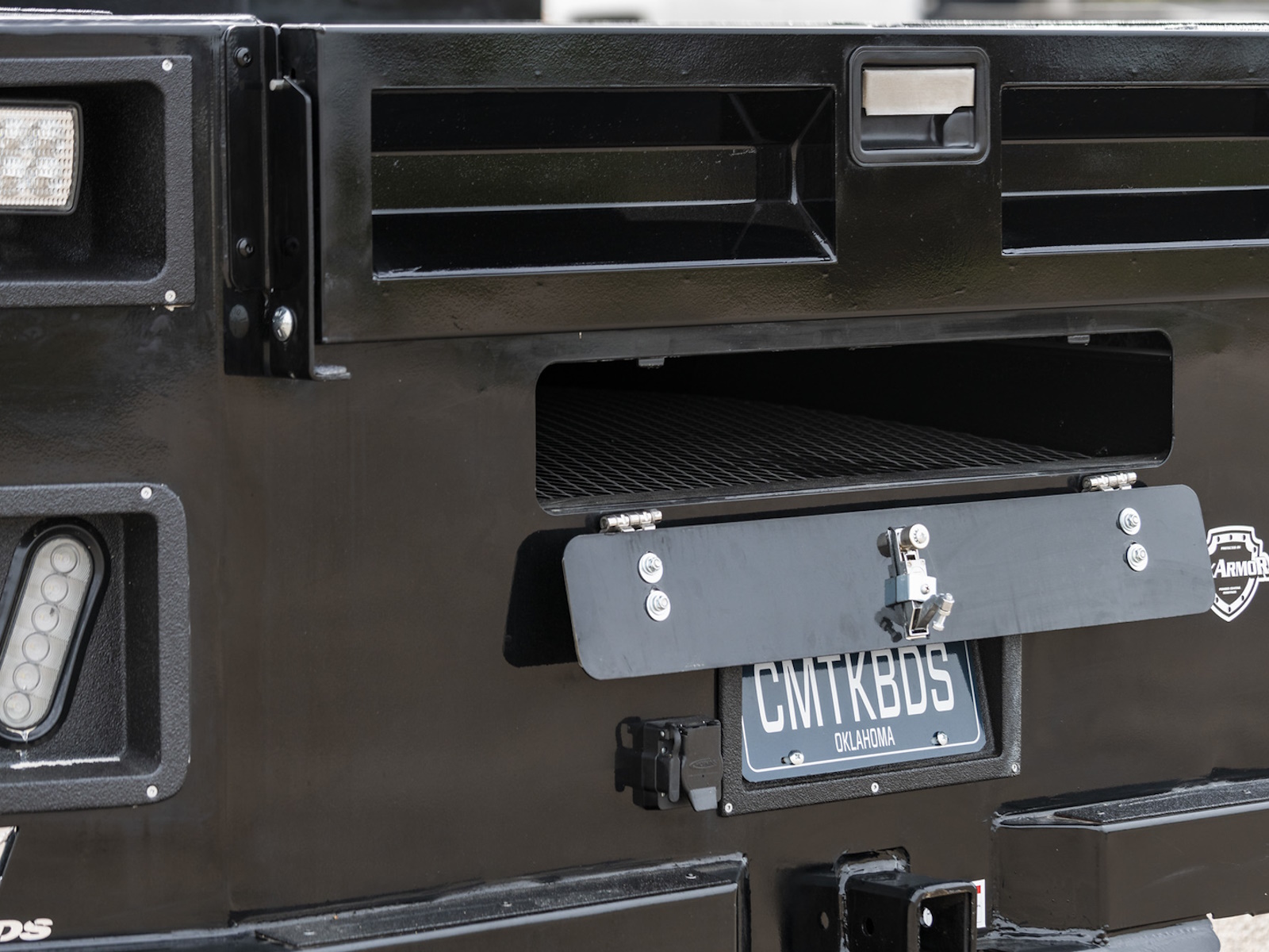 - This box has a treaded design and is conveniently located underneath the flatbed so you can store your shovels and other outdoor tools.