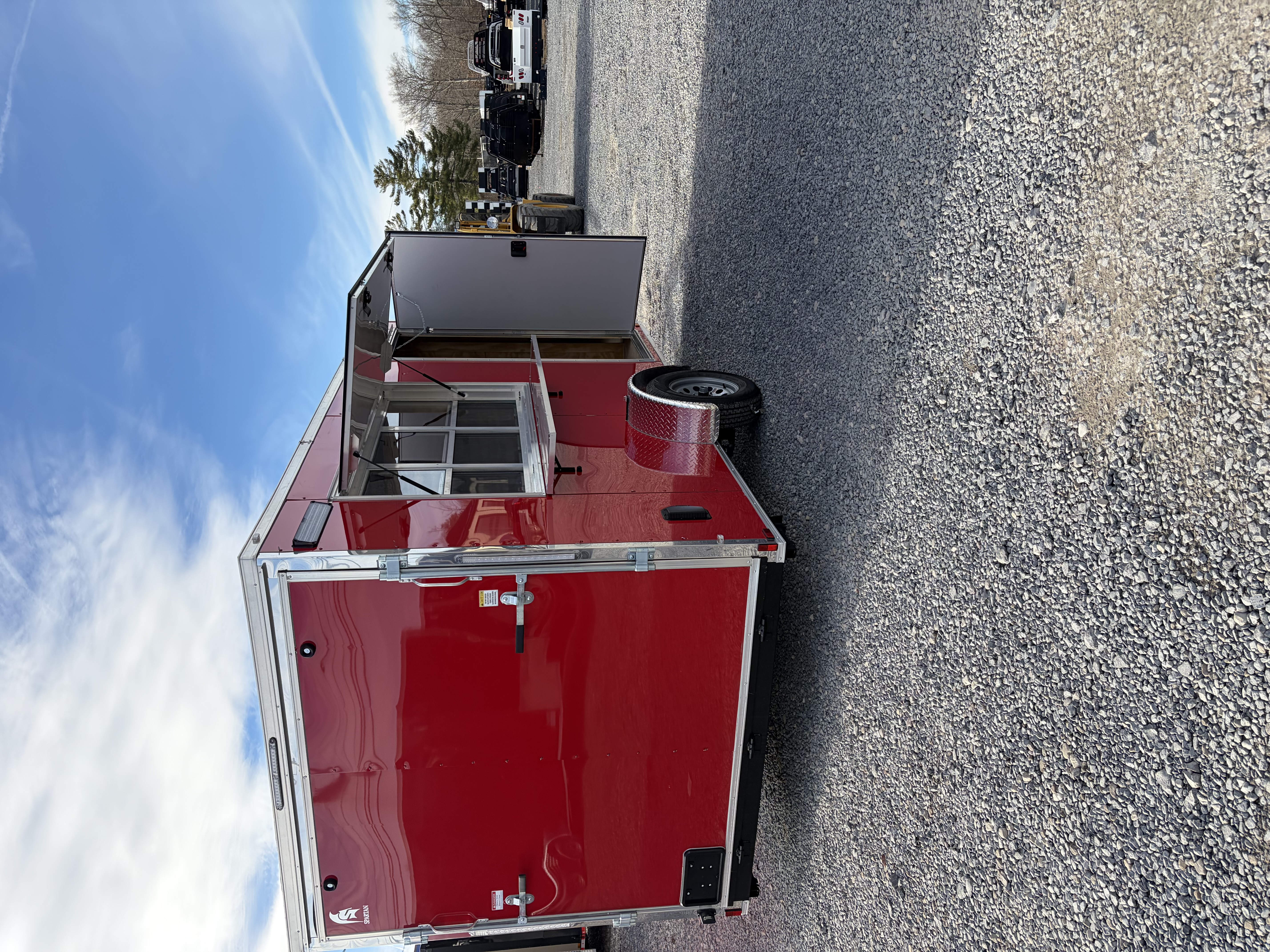 7' INTERIOR HEIGH, 72WX36H CONCESSION DOOR W/GLASS AND SCREEN, STABILIZER JACKS, WIRE AND BRACE FOR AC, WALL INSULATION, CEILING INSULATION, 12"X72"L FOLD DOWN SHELF,4' LED STRIP LIGHTS, 16" 12V LED EXTERIOR LIGHTS